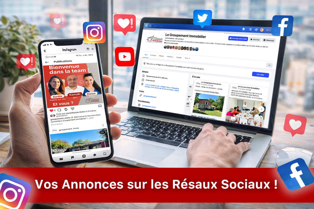 En plus de notre site et de nos portails partenaires, nous relayons l’ensemble de vos biens sur les principaux réseaux sociaux afin de toucher une audience plus large et plus qualifiée.